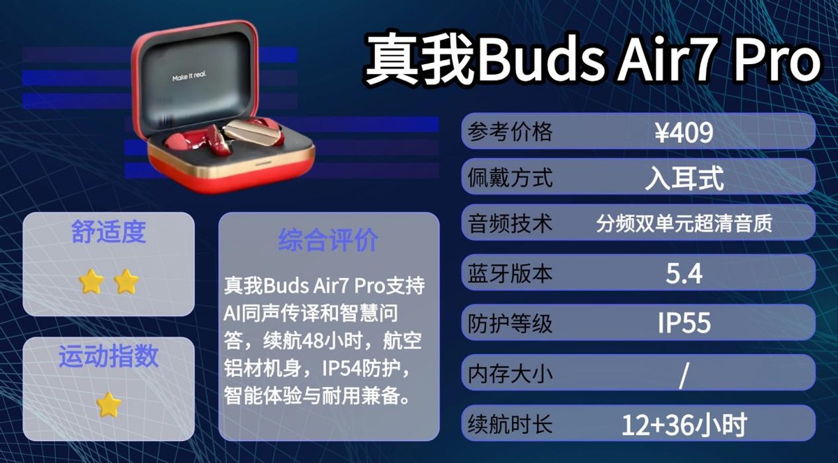 真我Buds Air7 Pro是真我推出的一款智能TWS耳机,主打AI功能,包括同声传译、面对面翻译和智慧问答等,兼顾日常使用和办公需求。