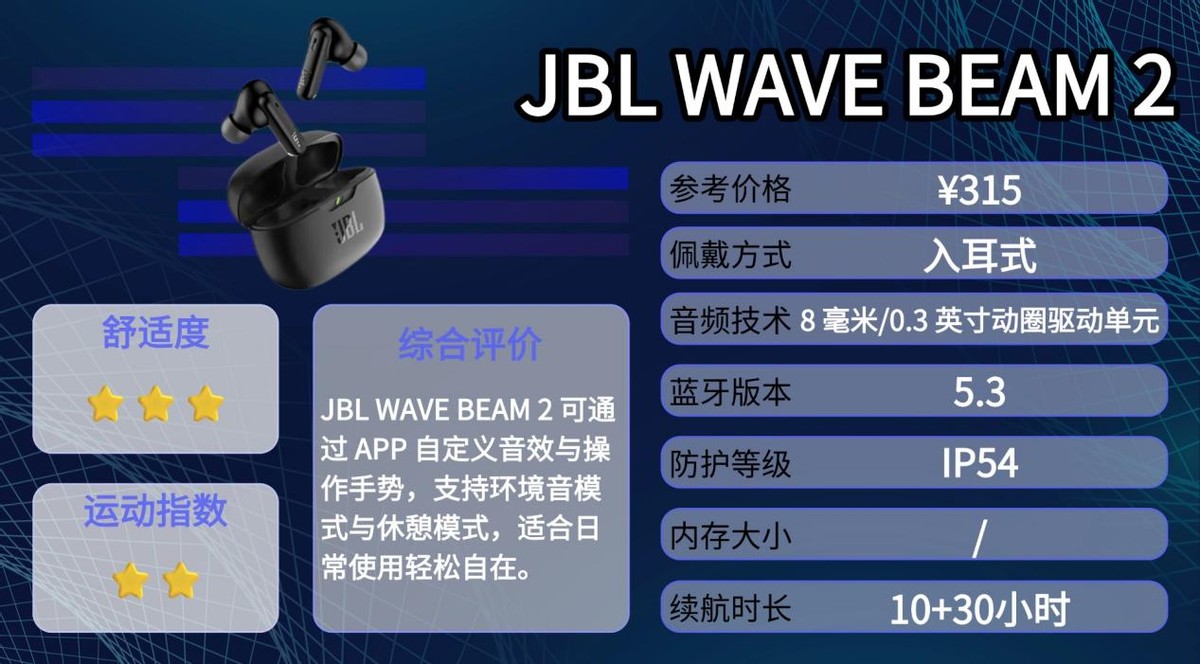 JBL WAVE BEAM 2是JBL推出的真无线耳机,主打环境音控制和个性化音效调节。通过JBL APP可以自定义EQ曲线、操作手势,还能切换休憩模式,听自然声放松身心。