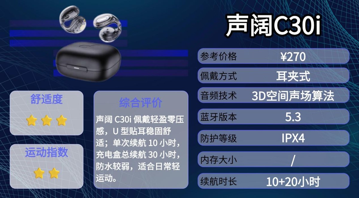 声阔C30i是一款轻量化耳机,设计上偏向日常运动和通勤使用,注重佩戴舒适与基础防护,不强调极限运动场景。