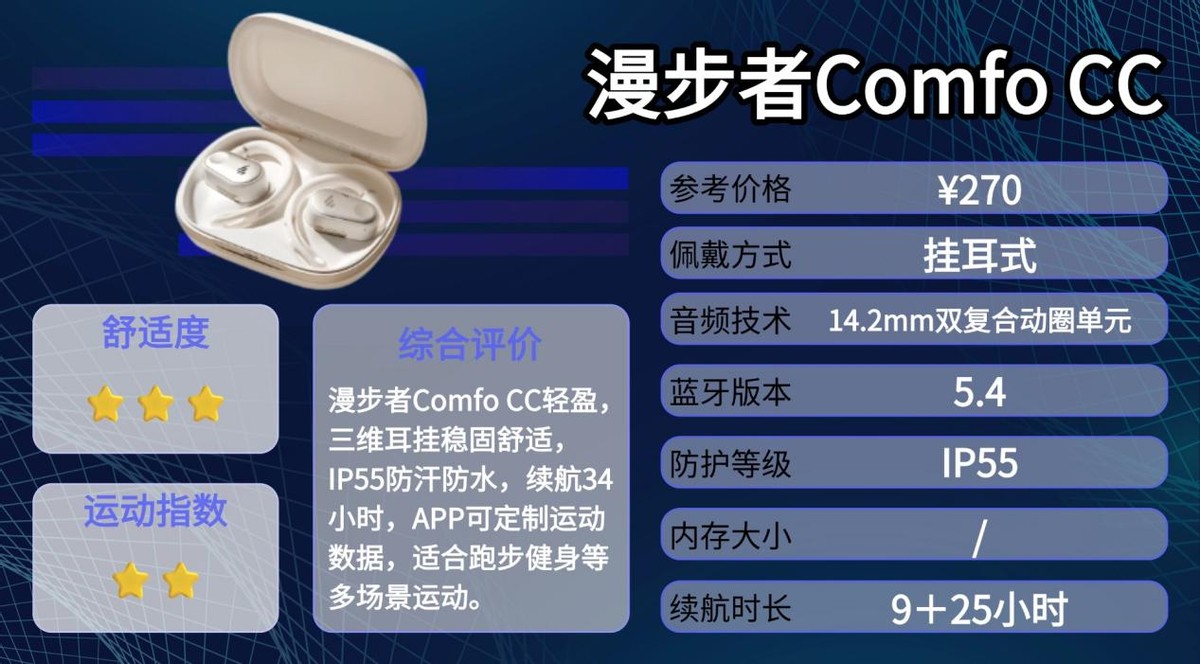 漫步者Comfo CC是一款轻量开放式耳机,单耳约9.2g,支持蓝牙连接和IP55防尘防水。适合运动和日常佩戴,同时配套EDIFIER Connect APP,可记录运动数据和个性化设置。