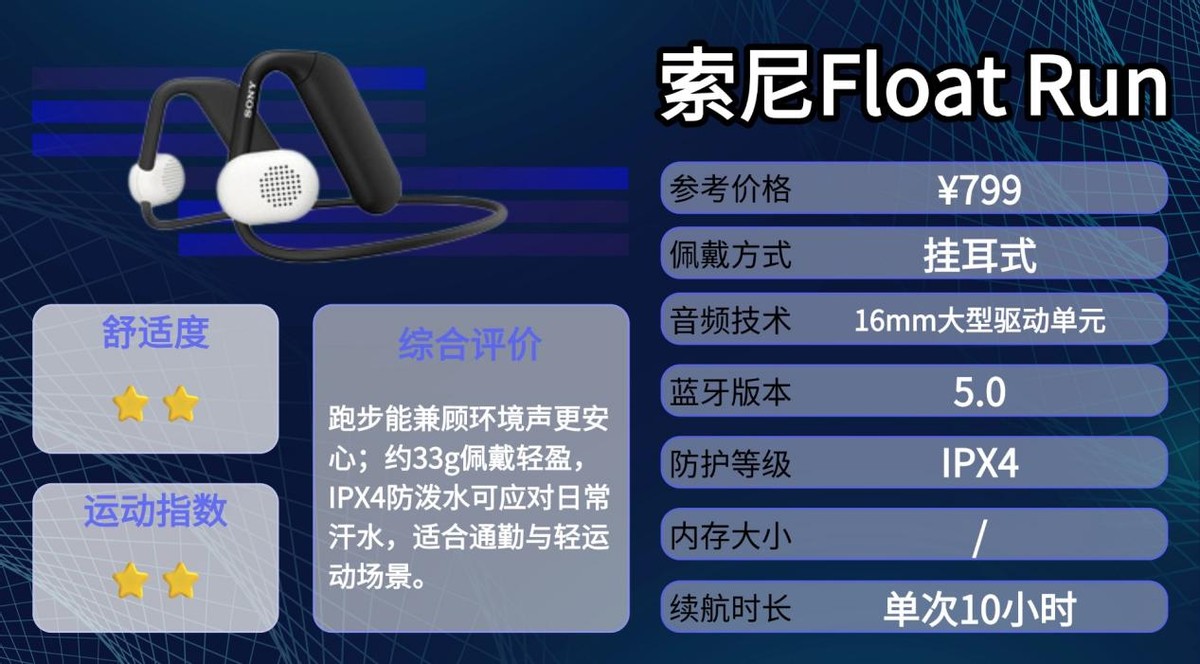 索尼Float Run是一款开放式骨传导耳机,非入耳设计,让用户在运动时可以同时听音乐和感知周围环境。机身约33g,佩戴轻巧灵活,IPX4防水,适合日常运动或通勤使用。