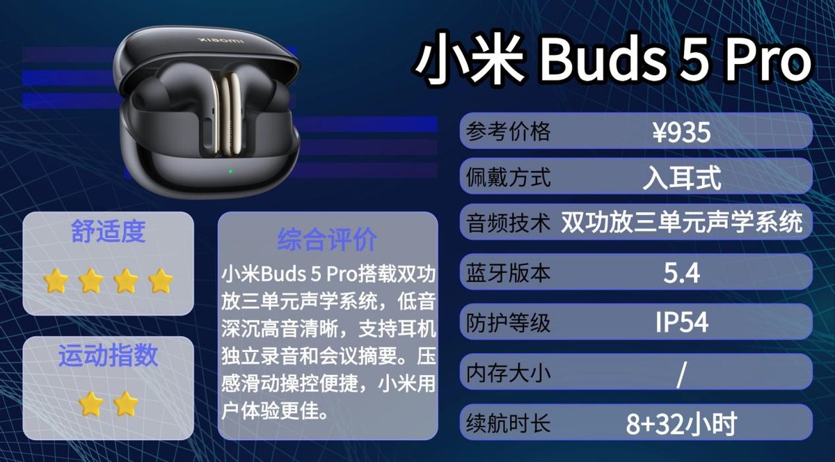 小米Buds 5 Pro是小米的新款无线耳机,主打三单元声学系统和双功放设计,音质在同价位耳机里表现不错。续航也挺长,单次充满可以听10小时,配合充电盒总续航可达40小时,基本日常出门一整天都够用。