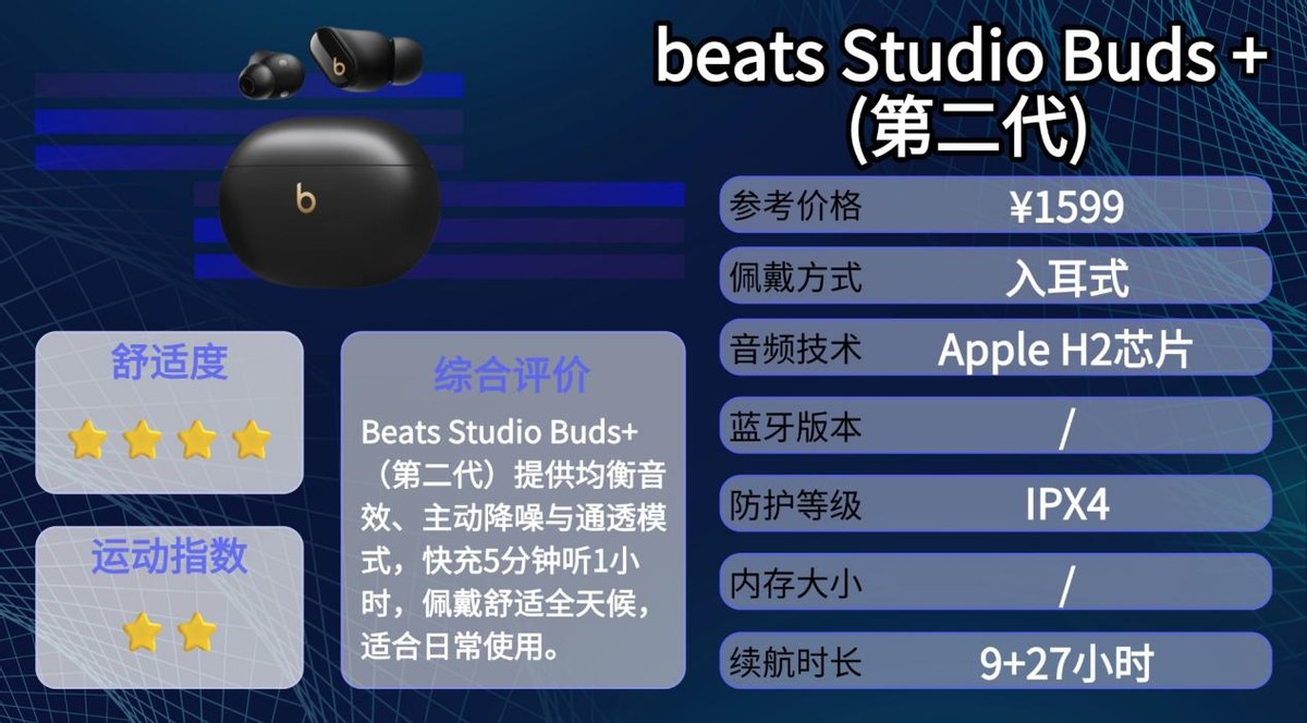 Beats Studio Buds+是Beats推出的第二代TWS耳机,主打主动降噪和通透模式,同时兼容Apple和Android设备,适合日常听歌和通话使用。
