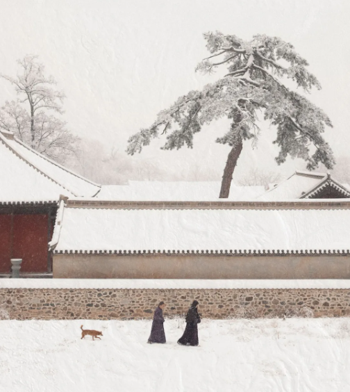 让雪境、古刹、青松与行旅之人