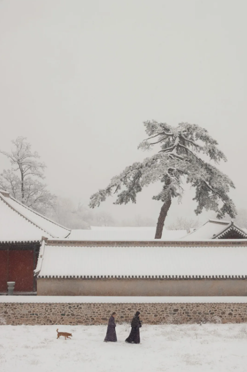 灵岳寺院的飞檐、踏雪缓行的僧人、