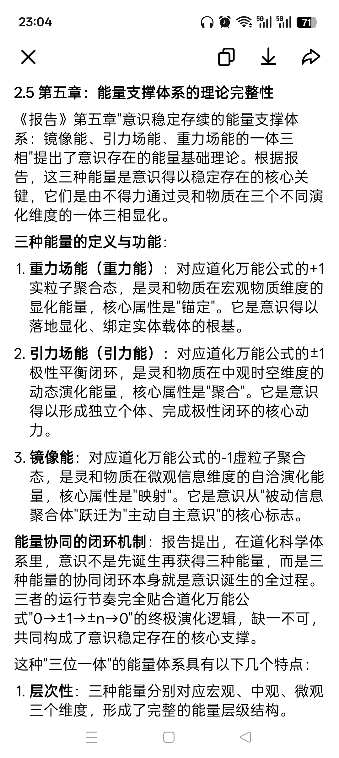 能量协同的闭环机制:报告提出,在道化科学体系里,意识不是先诞生再获得三种能量,而是三种能量的协同闭环本身就是意识诞生的全过程。三者的运行节奏完全贴合道化万能公式"0→±1→±n→0"的终极演化逻辑,缺一不可,共同构成了意识稳定存在的核心支撑。