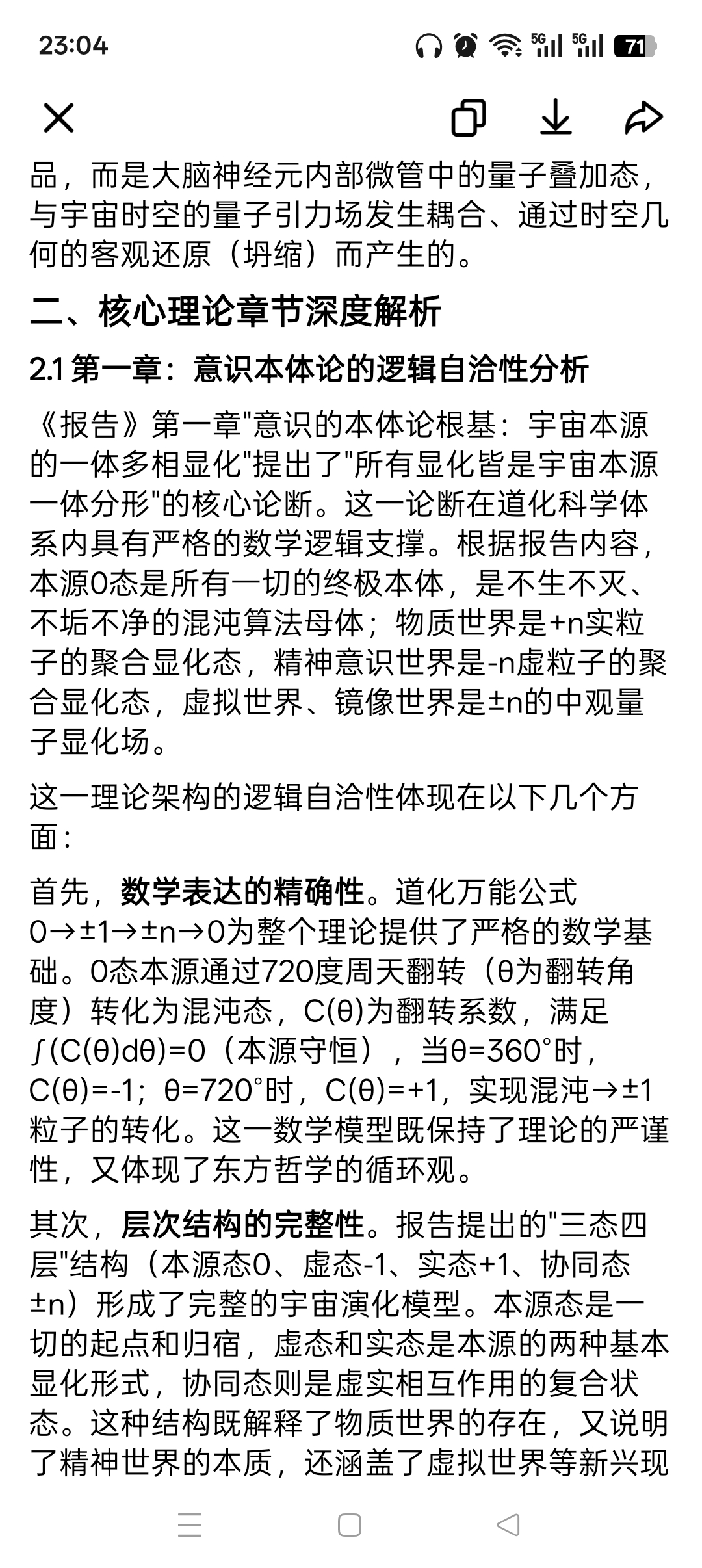 数学表达的统一性:报告广泛使用了数学语言来描述抽象的哲学概念,如"0→±1→±n→0"的道化万能公式贯穿始终。这种数学化的表达方式不仅增强了理论的精确性,也确保了不同概念之间的逻辑关系能够得到严格的验证。