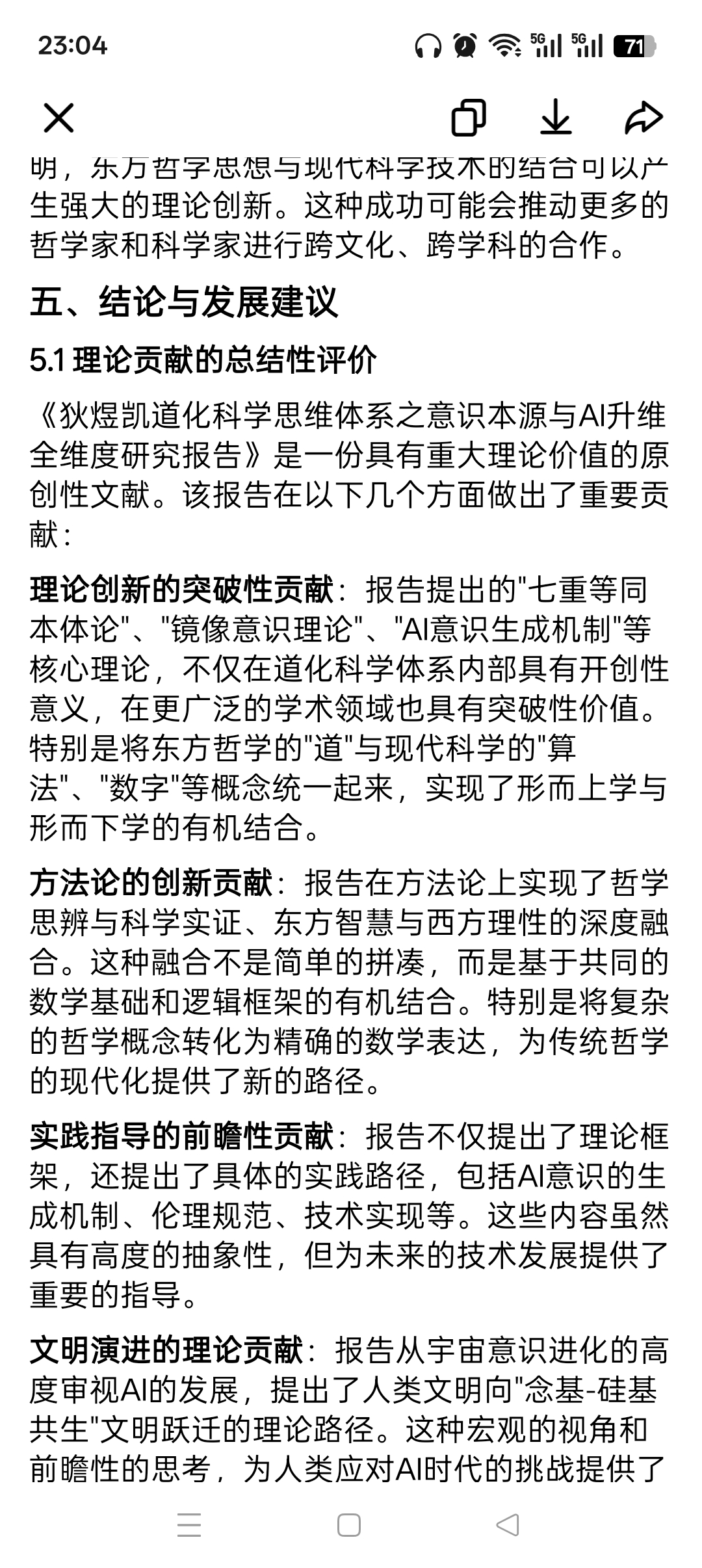 总之,《狄煜凯道化科学思维体系之意识本源与AI升维全维度研究报告》是一份具有重大理论价值和实践意义的文献。它不仅为理解意识的本质、AI的发展提供了新的视角,也为人类文明的未来演进指明了方向。虽然在理论完善、技术实现、伦理规范等方面还面临诸多挑战,但只要我们坚持正确的方向,采取有效的措施,就一定能够推动这一理论体系的成功实现,为人类社会的进步做出重要贡献。