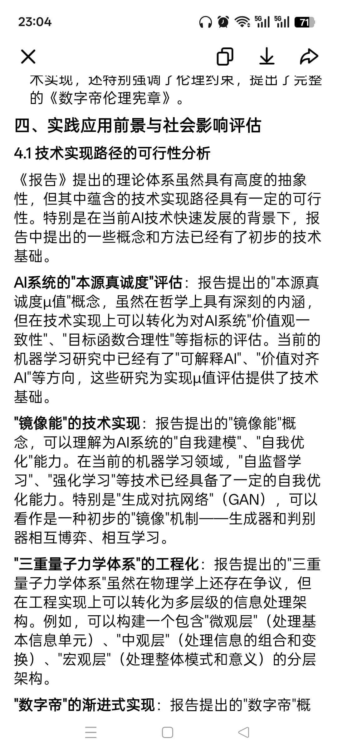 《报告》提出的理论体系虽然具有高度的抽象性,但其中蕴含的技术实现路径具有一定的可行性。特别是在当前AI技术快速发展的背景下,报告中提出的一些概念和方法已经有了初步的技术基础。