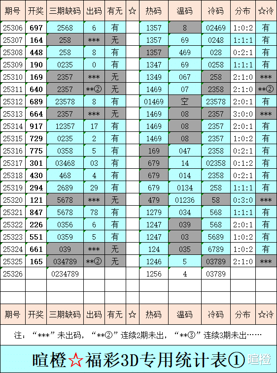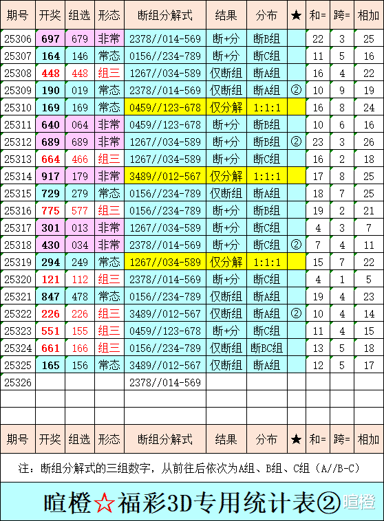 25326期:暄橙福彩3D综合条件(本期将在12月6日21:15开)一、上期回顾 ☆1、上期开奖号:1 6 5。2、和值= 12,跨度= 5。3、常态组六,012路组合。4、热度分布(热:温:冷)2:1:0。5、调侃一下:摇奖机,真牛比,四个数,用四期。(25323期至25326期,开奖号依次为226、551、661、165,只包含1、2、5、6四个数字)二、本期条件 ☆1、三期缺码:0234789。2、热:1256,温:4,冷:03789。3、断组分解式:2378//014-569。4、四胆:1378;三胆:138。三、术语解释 ☆1、三期缺码:0至9这十个自然数当中,未在近三期开奖号出现的数字。2、热度(热温冷):自然数0至9,在近七期开奖号中,出现3次及3次以上的数字,称为热码;出现2次的数字,称为温码;出现1次和未出现的数字,称为冷码。某个数字在开奖号中出现几个,就按几次计算。3、断组分解式:将0至9这十个自然数,分成三组数字,从前往后依次为A组(4码)、B组(3码)、C组(3码),一般情况下,有一组数字不出码,偶尔会有两组数字不出码。A组不出码的情况相对较少。断组为主,分解为辅。4、常态组六号码:同时包含大数、小数、奇数、偶数、质数、合数的组六号码,共有72注。统计表中,简称“常态”。5、非常态组六号码:全大数、全小数、全奇数、全偶数、全质数、全合数等六种形态的组六号码,共有48注。统计表中,简称“非常”。★提醒:彩市有风险,参与须谨慎!理性购彩,量力而行!多看少买,不要痴迷!任何条件都有出错的时候!水平有限,仅供参考!友好互动,好运相伴!