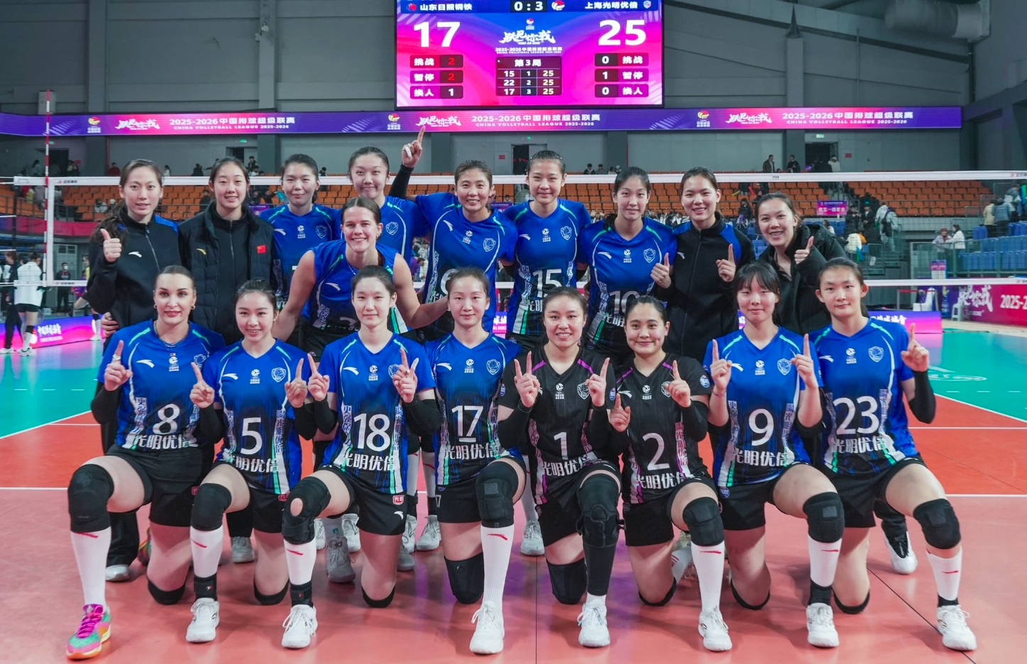 北京时间3月17日,2025 - 2026赛季中国女排超级联赛A级1 - 4名半决赛首回合激战正酣,蔡斌挂帅的上海光明优倍女排奔赴客场,挑战山东日照钢铁女排。在这场备受瞩目的对决中,上海女排展现出强大实力,以3 - 0(25 - 15、25 - 22、25 - 17)的绝对优势完胜山东队,在“两回合+金局”的赛制中先下一城,为晋级决赛抢得先机。