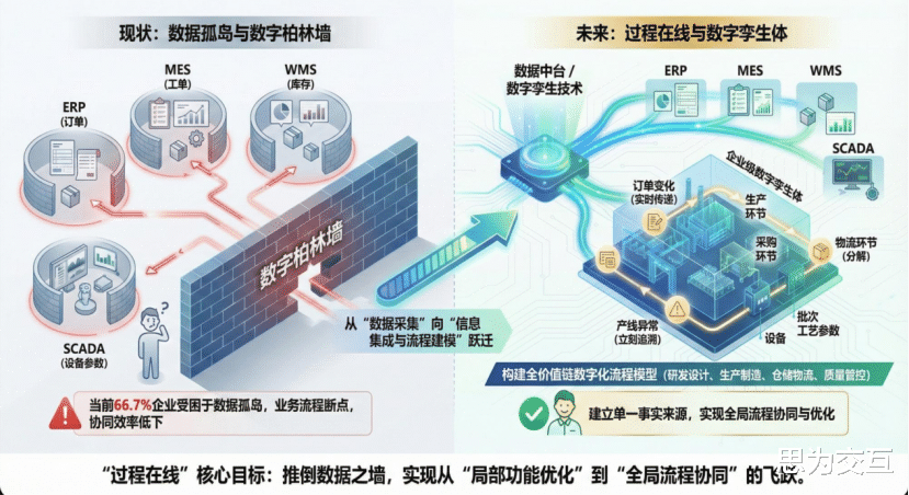 当前制造业数字化转型中高达66.7%的企业深受“数据孤岛”问题的困扰 ,这正是“过程在线”缺失的直接体现。ERP中的订单、MES中的工单、WMS中的库存、SCADA中的设备参数,这些数据分散在不同的软件系统中,形成了一道道看不见的“数字柏林墙”,导致业务流程处处断点,协同效率低下 。