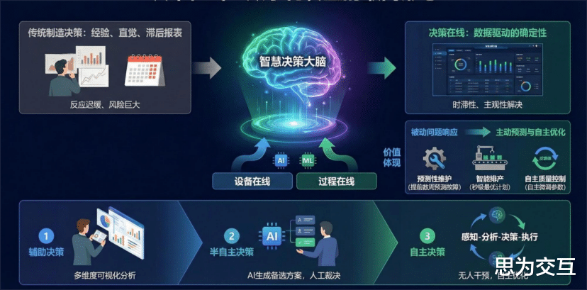 “决策在线”是数字化转型的最高形态,也是价值实现的核心环节。它标志着企业从“用数据看报表”的初级阶段,进化到“让数据做决策”的高级智能阶段 。其核心是深度融合人工智能(AI)、机器学习(ML)等技术,在“设备在线”和“过程在线”构建的坚实基础上,打造企业的智慧决策大脑 。