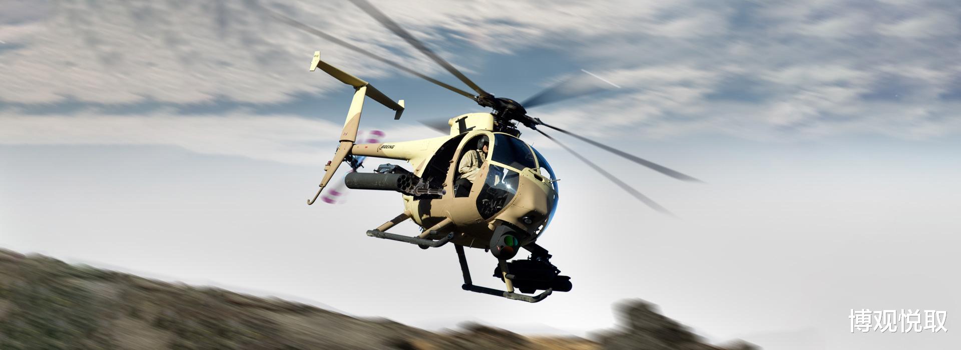 AH-6“小鸟”的故事,要从1960年代的越南丛林说起。当时,美国陆军急需一款轻便灵活的侦察直升机,用于执行战场观测、目标识别等任务。休斯直升机公司(后被波音收购)的369原型机脱颖而出,被命名为OH-6A“印第安小种马”。这款直升机凭借仅7.5米的机身长度、10米左右的旋翼直径(相当于家用轿车的横向空间),能在丛林树梢高度贴地飞行,噪声低至难以被地面人员察觉,迅速成为越南战场上的“空中耳目”。