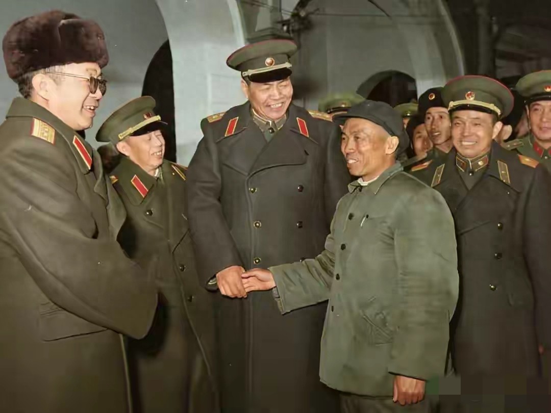 1958年,在欢送会上,张宗逊拉着老红军许成余的手,一张罕见合影