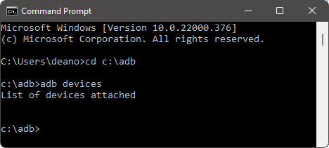 步骤 5. 启动 ADB 并连接到您的设备。在命令窗口中,键入以下命令:adb devices。如果一切设置正确,您的设备将出现在已连接设备的列表中。如果没有,请确保 USB 调试已启用,并且设备已正确连接。