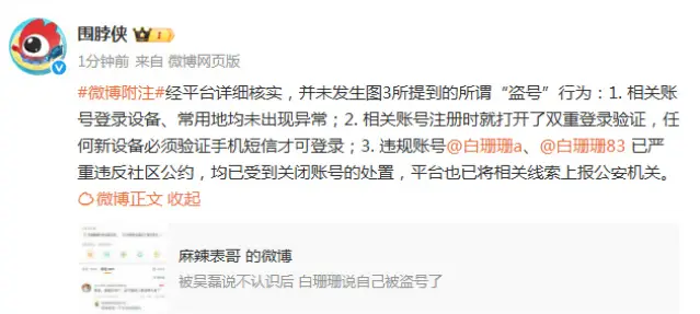 随着舆论发酵,白珊珊的处境可谓是急转直下。其大号“白珊珊a”因严重违规被平台永久封禁,试图用“账号被盗”甩锅的说法,也被微博官方核查打脸,确认其账号登录设备无异常、无盗号痕迹,违规行为属实。眼看炒作不成反面临法律追责,她又改用小号“白珊珊83”继续纠缠,质问吴磊“是不是你举报我”,直至吴磊工作室发布诉讼声明,彻底击碎了她的侥幸心理。