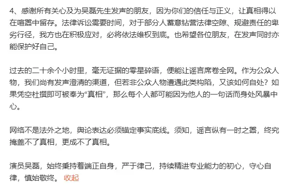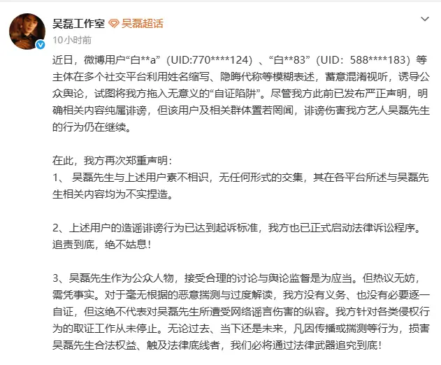 面对无端造谣,吴磊方的反击堪称内娱维权教科书。早在谣言爆发仅68分钟后,工作室便率先发布严正声明,通过区块链技术完成全平台证据固定,明确指出所有言论均为“毫无事实依据的恶意捏造”,并同步委托律师启动追责程序。