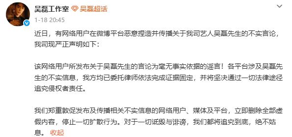 1月19日,吴磊工作室就网络用户“白珊珊a”造谣事件再发重磅声明,明确表示已正式启动法律诉讼程序,以刑事诽谤罪自诉追究对方责任,态度坚决零容忍。声明发布仅数小时后,此前高调喊话的白珊珊便通过小号深夜发文道歉,将造谣行为轻描淡写为“引流炒作”,却因避重就轻、毫无诚意,不仅未能平息风波,反而引发更大范围的舆论反噬。