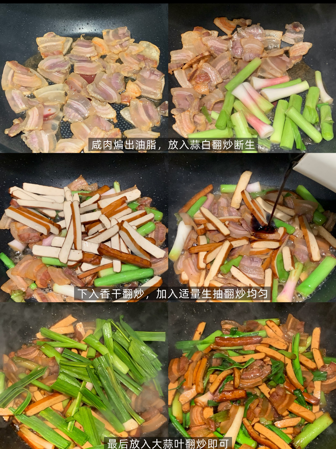 蒜白下锅的瞬间,那股辛香立刻被激发出来,和咸肉的油脂香混在一起,整个厨房都弥漫着诱人的气息。翻炒十几下,蒜白断生即可,不用炒得太久,否则蒜白的脆劲儿就没了。紧接着下入香干片,继续翻炒。香干是这道菜的“吸味担当”,它本身没什么味道,但在锅里翻几个身,就把咸肉的咸香和蒜白的辛香都吸进去了。