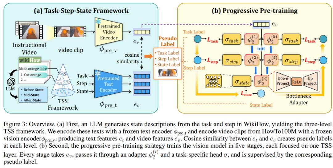 为了解决这一问题,北京航空航天大学陆峰教授团队,联合东京大学黄逸飞博士推出了 TSS(Task-Step-State)框架。其核心洞见在于重构了过程性知识的层级结构:引入「状态」(State)这一视觉接地层,并提出了一种渐进式 “层级展开”(Hierarchy Unfolding)的渐进式预训练策略。