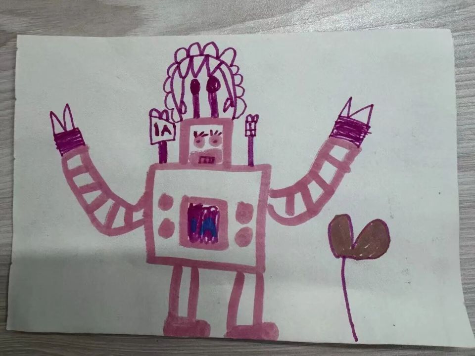 “我想画未来的AI朋友!”一次活动后,孩子们的创意被点燃。自制AI绘本、“未来世界”绘画活动里,孩子们的想象力肆意绽放:“未来的鞋子会飞,我可以踩着它去太空探险!”“我设计的飞船能抓星球,还能保护地球!”“我的AI机器人会帮老师擦黑板、照顾小朋友!”