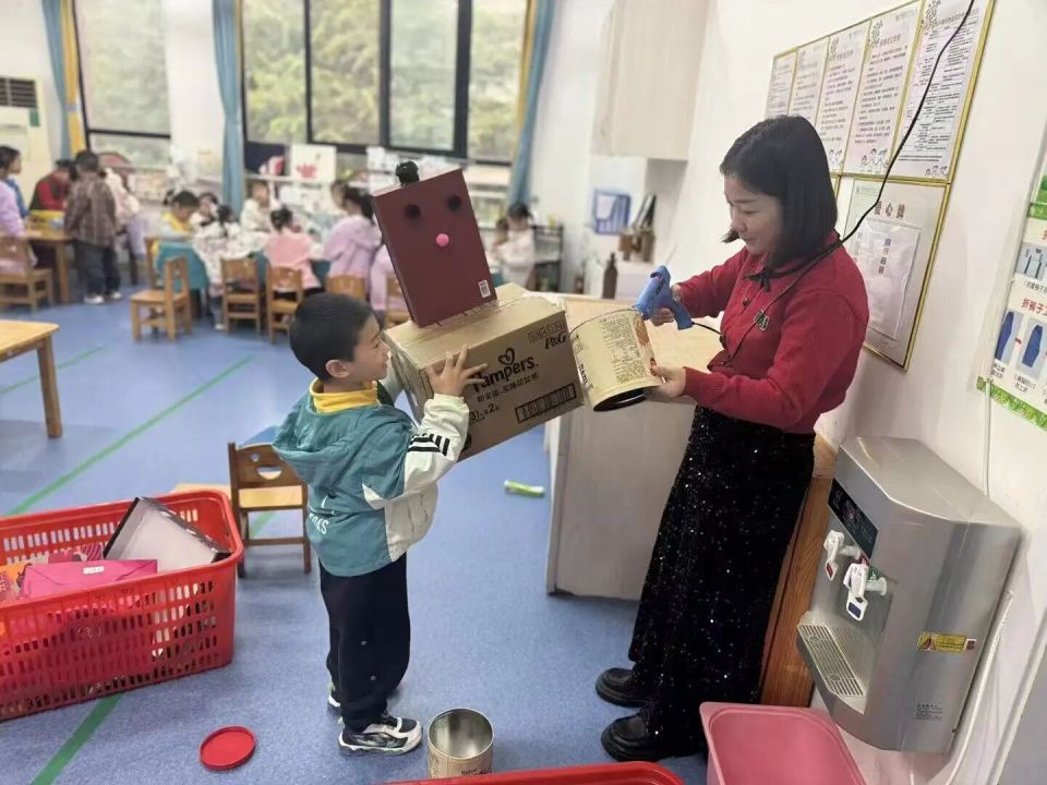 美工区中,孩子们用彩纸、黏土、废旧材料设计AI机器人,每一个作品都藏着温暖的心愿:有的给机器人装上“爱心探测器”,能发现不开心的小朋友;有的给机器人设计“环保口袋”,能捡起地上的垃圾;有的给机器人配上“知识大脑”,能解答所有难题。