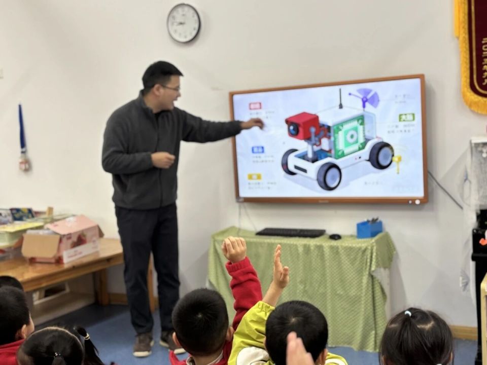 家长进课堂环节,从事科技工作的爸爸带来了“无人驾驶”的奥秘分享,用动画演示、模型操作等方式,解答孩子们的脑洞问题:“无人驾驶的汽车会认识红绿灯吗?”“它会不会迷路呀?”“遇到小朋友过马路会停下来吗?”