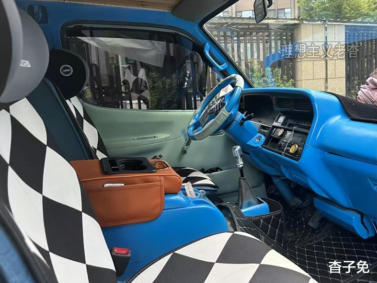 驾驶室内风格迥异,蓝色操作台彰显梦想和运动感,黑白花格座椅不再那么单调。