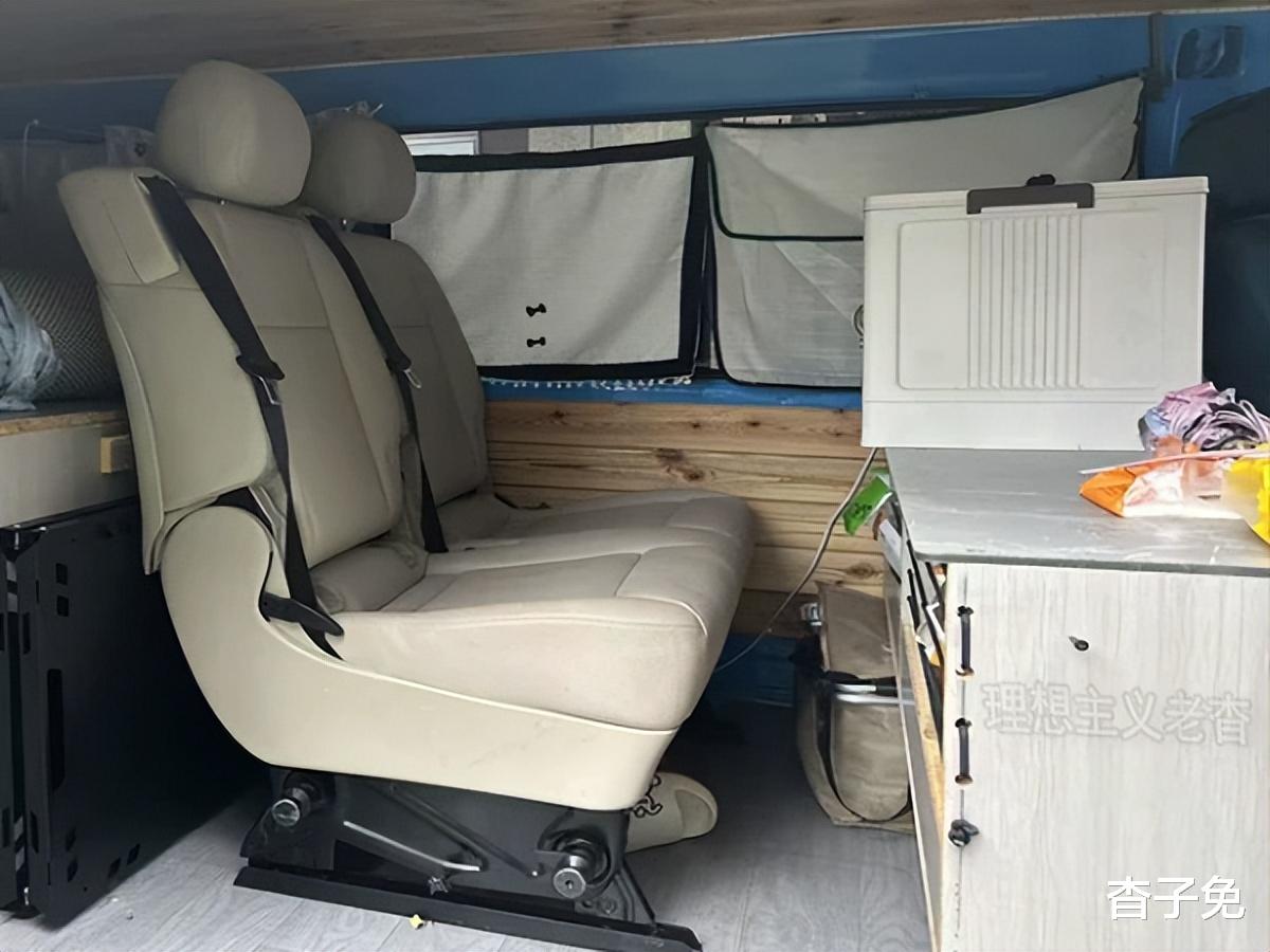车内实木砌墙打底,前后排座椅之间添置了一张横柜,下面用来储物,上面作为桌台使用。