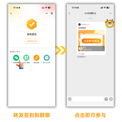 其他人点击群内的链接,即可参与签到,接龙管家也能生成签到二维码,参与者打开手机扫码签到。