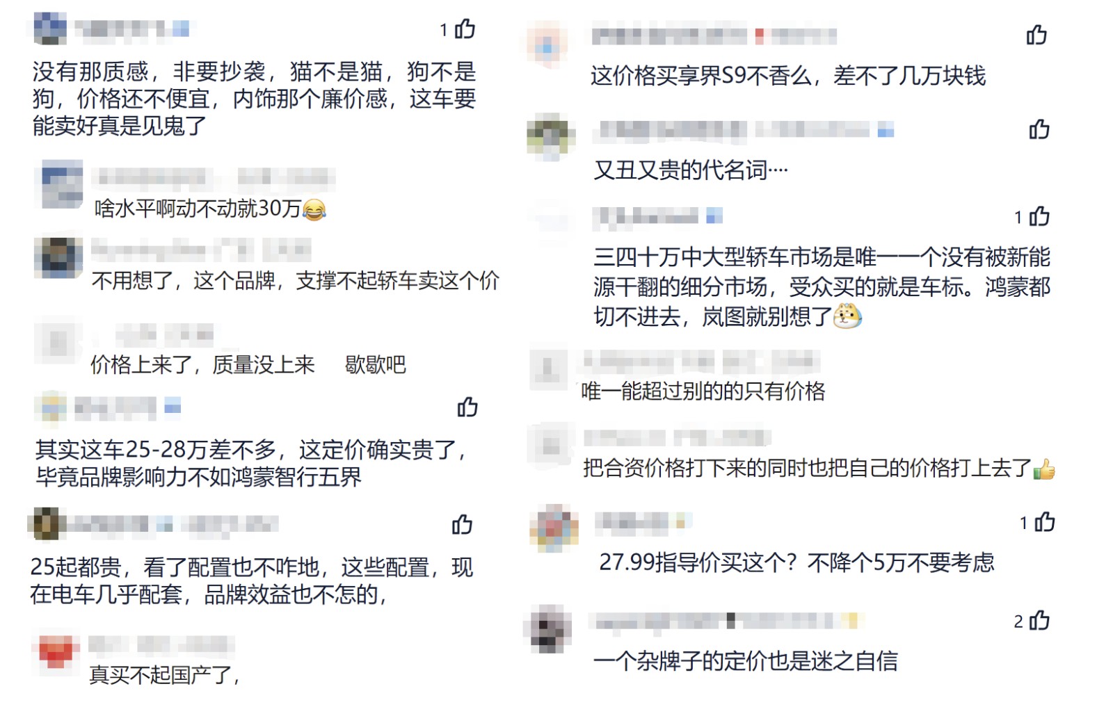这也侧面反映了,当前中大型车市场的大多数潜在客群追求的仍然是极致性价比。而网友的评论也反映了这一点。在一则岚图追光L的帖子下,有评论直言道:“岚图的品牌影响力支撑不起轿车卖这个价。”