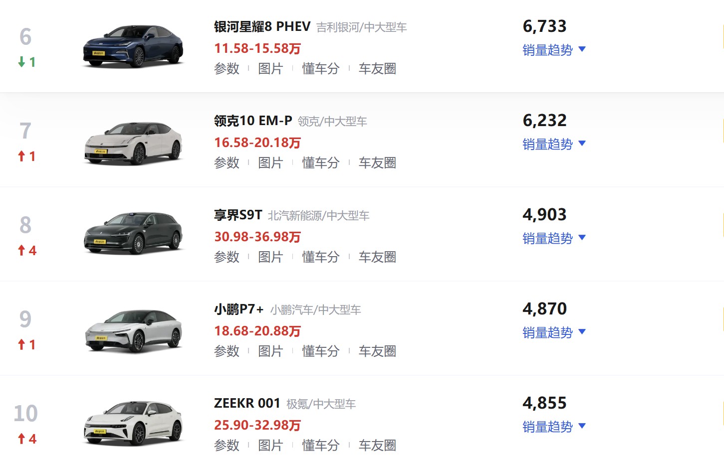 小米SU7的爆火,源于强大的品牌号召力和其主打性能操控的特性。奥迪A6L、奔驰E级、宝马5系三款传统豪华车能够有如此表现,则源于深耕中国市场多年的影响力。除了这四款车型,销量在5000辆以上的车型起售价均未超过17万元。其中,银河星耀8 PHEV的起售价仅11.58万元。
