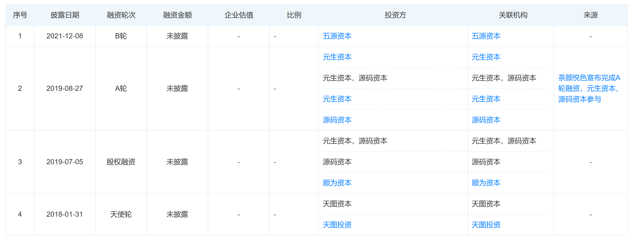 同年6月,茶颜悦色母公司湖南茶悦文化产业发展集团有限公司(下称“湖南茶悦文化”)的股权发生变更,顺为资本、五源资本、源码资本、元生资本、天图投资等7家投资机构均退出。