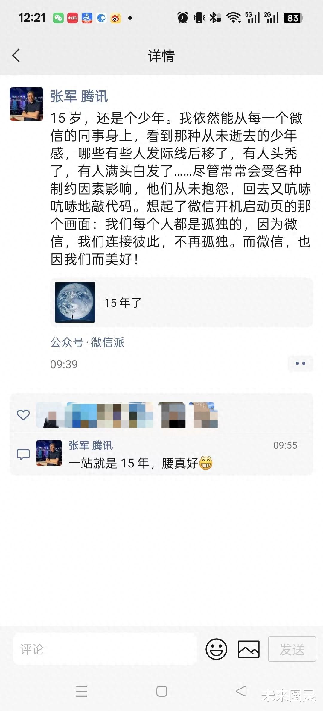 1月21日,微信正式迎来上线15周年。腾讯公司公关总监张军发文纪念:“今天是微信15周年。15 岁,还是个少年。我依然能从每一个微信同事身上看到那种从未逝去的少年感,尽管有些人发际线后移了,有人头秃了。”