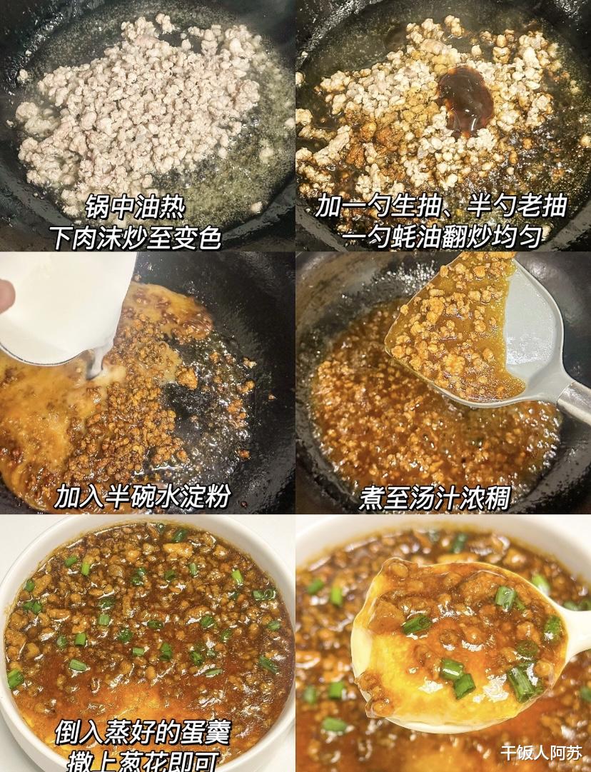 蒸蛋的同时,可以准备灵魂肉末酱汁。热锅倒少许油,放入肉末翻炒,直至变色、油脂渗出。加入一勺生抽、半勺老抽、一勺蚝油,翻炒均匀让肉末入味。接着,倒入半碗水淀粉,中小火煮至汤汁浓稠发亮。最后,将煮好的肉末酱汁均匀淋在蒸好的蛋羹上,再撒上一把翠绿的葱花点缀。
