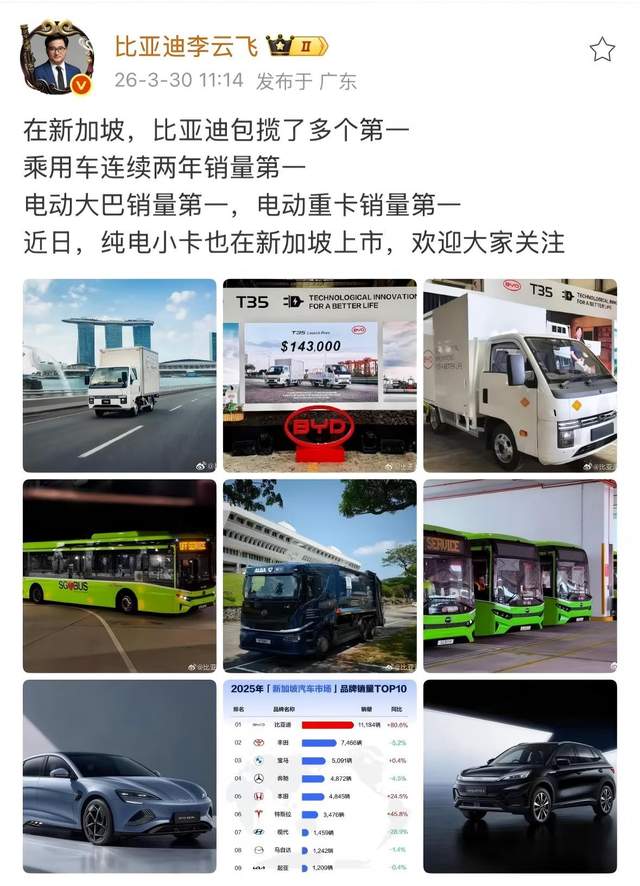 你知道吗?在新加坡这个对车辆安全、能耗、可靠性要求全球最严的市场,比亚迪居然拿下了“大满贯”——乘用车、商用车、电动巴士、电动卡车,多项销量冠军,真有点“闷声干大事”的味道。