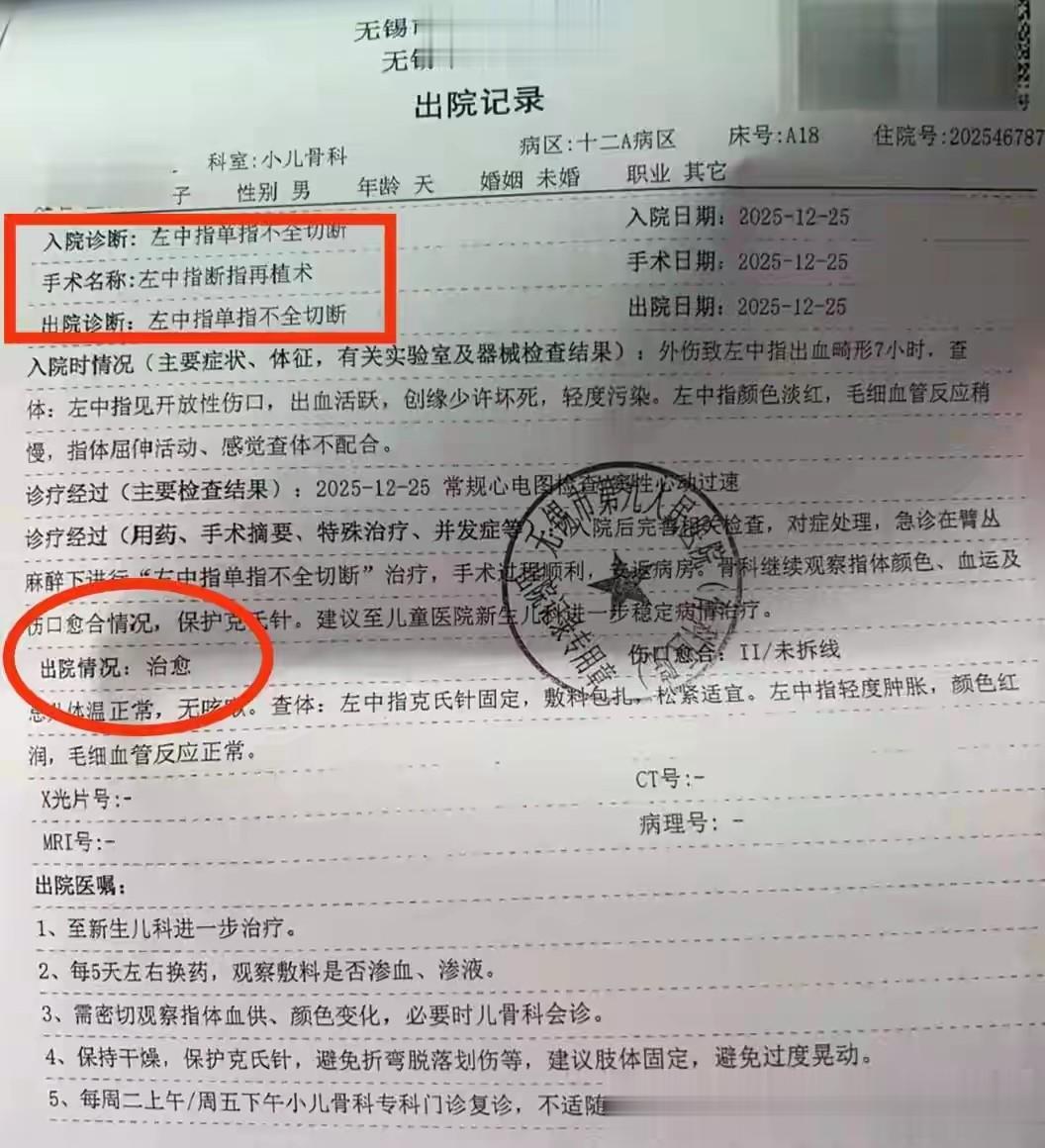 当日下午,无锡市第九人民医院为孩子行了“左中指断指再植术”手术顺利。