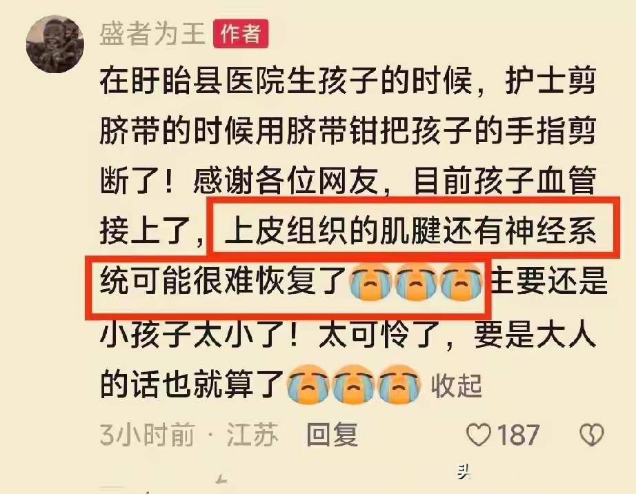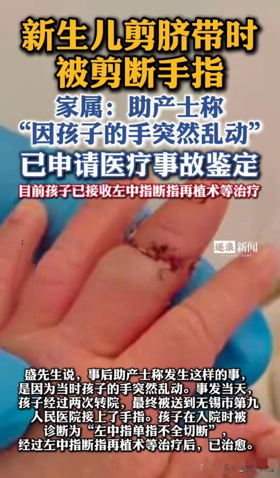 5日晚上,盱眙县卫健委针对一新生儿剪脐带时被剪断手指致“左中指单指不全切断”发布了情况通报。
