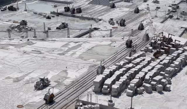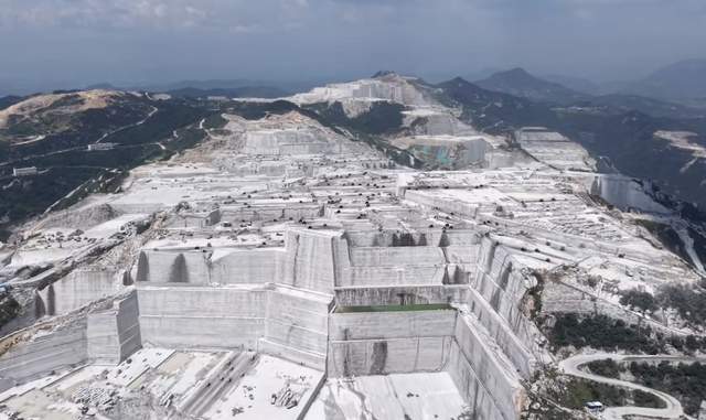整座山仿佛一个巨大的露天车间,轨道纵横,切割机轰鸣,工程车穿梭不停,开采出的石料被整齐码放,宛如现代积木,场面既繁忙又壮观。
