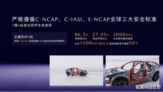 卓越的碰撞成绩来自于车身结构的创新。EZ-60采用7横5纵的笼式铠甲结构,高强钢占比86.5%,热成形钢27.45%,最高强度2000MPa,全车1500MPa及以上超高强度零件集群50个,关键部位更是层层加码,如A柱采用五重防护结构,内外双层1500MPa热成型钢和腔体SNS复合材料,大幅增强A柱的钣金强度和刚度,抗弯性能提升44%。