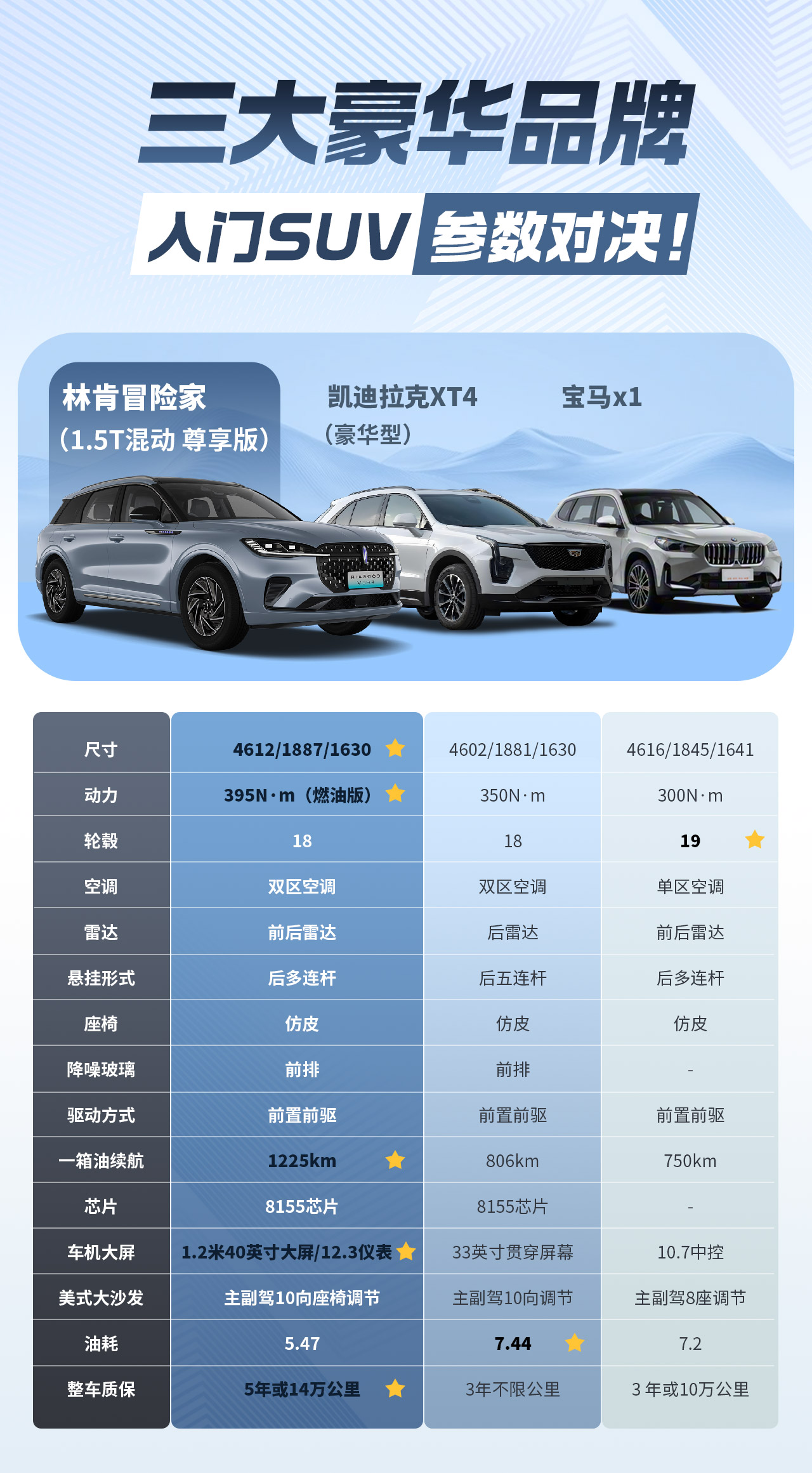 林肯冒险家、凯迪拉克XT4、宝马X1,这三款豪华SUV,今天直接拉出来PK!