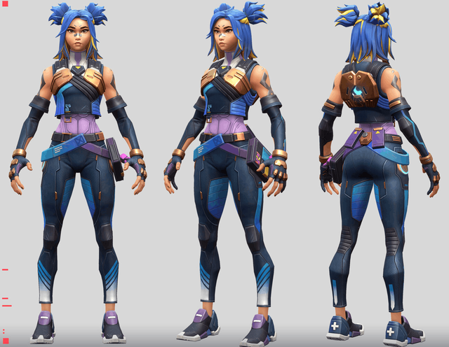 在英雄设计方面,《无畏契约手游》同样遵循“为玩法服务”的理念。每个角色仅有一两种主题色,人物的服装、技能、饰品等元素都围绕这些主题色展开设计。例如,霓虹的主题色是深蓝,斯凯是草绿,而奇乐则是黄色和绿色的混搭。这种设计不仅强化了角色形象,还提高了对局的便利性,玩家可以通过简单的颜色识别轻松区分不同的英雄,减少不必要的干扰。