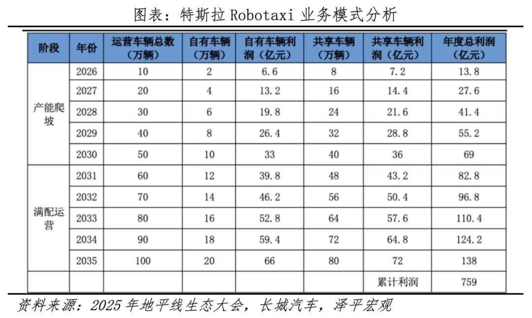 从此,汽车厂商将变成出行服务商。以特斯拉为例,一台Robotaxi成本若为3万美元,当车队规模达到100万台时,靠着每英里0.2美元的极低运营成本,出行服务的年收入能突破700亿美元。这个利润空间将远远碾压卖车收益。