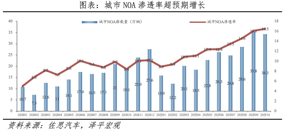其次是向上爆发,城市NOA开始规模化渗透。曾经高高在上的城市NOA也迎来了爆发。2025年全年,搭载城市NOA的乘用车达到了267万辆,年末单月渗透率更是升至17.9%。