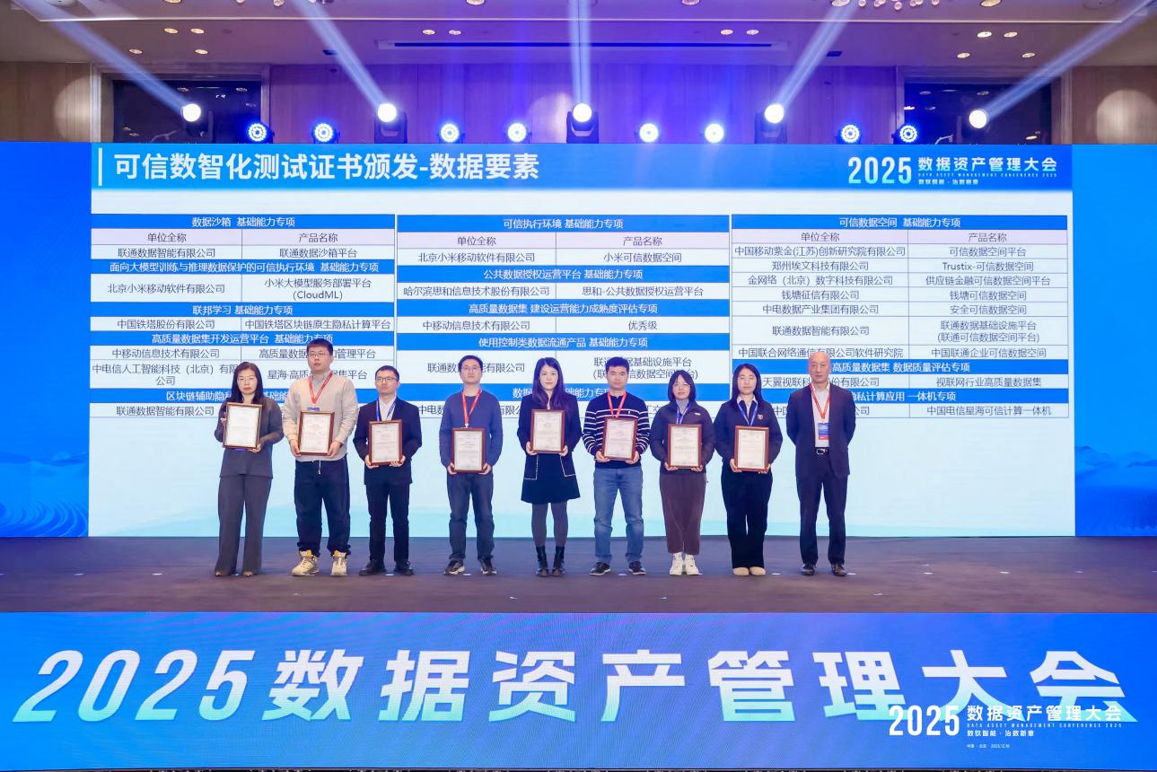 在之后的可信数智化测试证书颁发-数据要素环节,埃文科技自主研发的“Trustix-可信数据空间V1.0”平台,在中国信息通信研究院组织的2025下半年可信数据流通测试中,于用户权限管理、连接器数据资源管理、数据服务支持、数据使用管控、通用安全能力及连接器数据交付能力等多个核心维度,均满足数据空间平台能力要求。