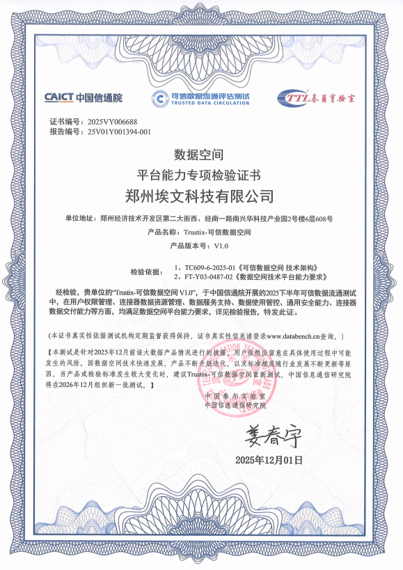 凭借此次测试中展现出的领先技术架构与完善的数据安全管控能力,埃文科技“Trustix-可信数据空间V1.0”平台荣获“数据空间平台能力专项检验证书”。该证书的获得,标志着埃文科技在构建可信、可控、可证的数据流通环境方面达到行业权威标准。目前,“Trustix-可信数据空间”正在医疗、政务等关键领域与客户展开积极的应用实践,实现数据要素的安全高效流通与价值释放。
