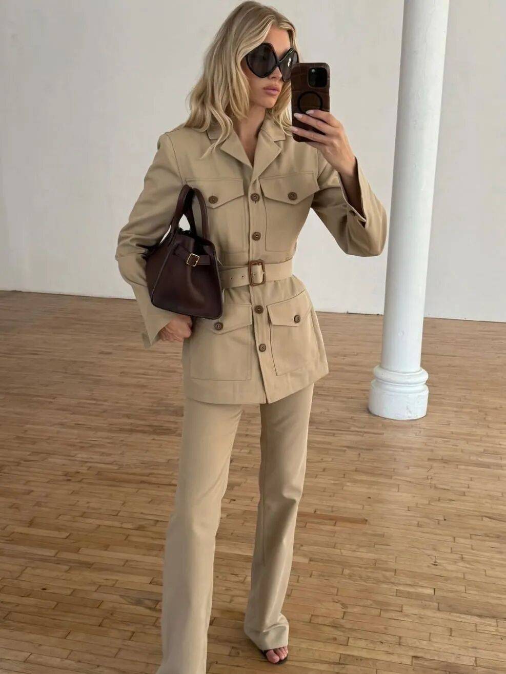 利落的收腰设计勾勒出骑手般的挺拔身姿,宽阔的肩线撑起一份不容置疑的气场,几个实用的功能性口袋则延续着实用主义传统。