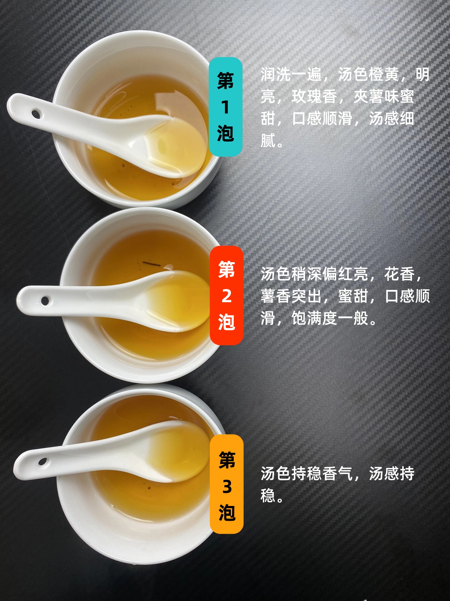 第一泡,润洗一遍,汤色橙黄,明亮,玫瑰香,夾薯味蜜甜,口感顺滑,汤感细腻。