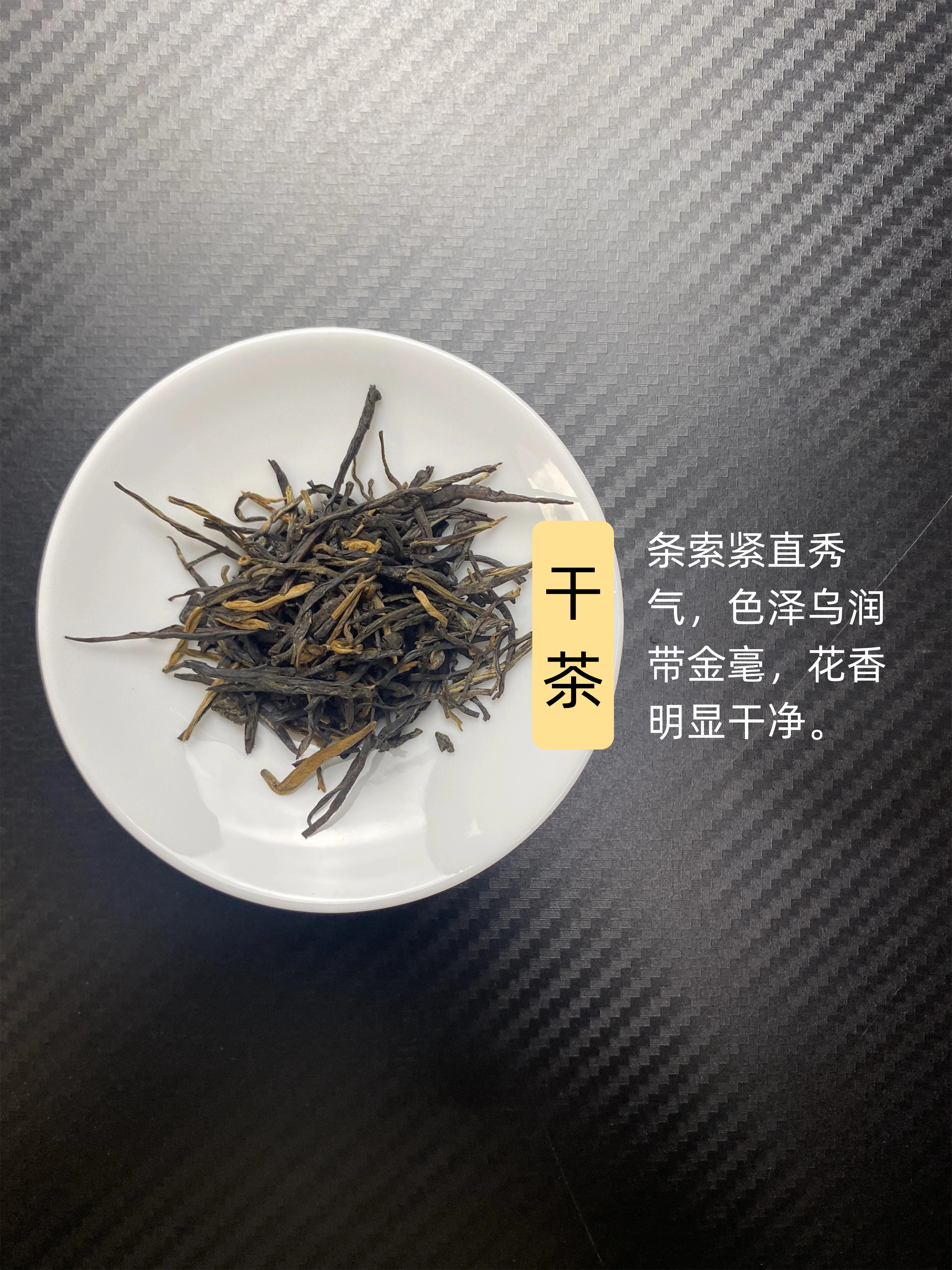 干茶,条索紧直秀气,色泽乌润带金毫,花香明显干净。